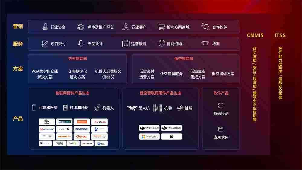 聚合国内外先进的物联网硬件产品品牌,,,,聚焦数字化仓储、、、、机器人运营、、低空智联网等领域,,共同打造适合客户业务场景的解决方案并提供交付服务